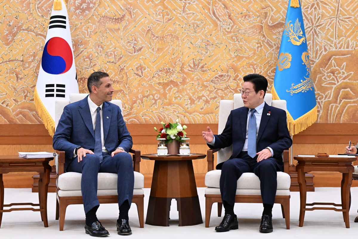 이재명 대통령이 15일 청와대 본관에서 아랍에미리트(UAE) 실세로 꼽히는 칼둔 칼리파 알 무바라크 아부다비 행정청장을 만나 양국 간 협력 사업을 논의하고 있다. 칼둔 청장의 이번 방한은 방위산업·인공지능(AI)·에너지 등 분야의 협력 방안을 구체화하기 위한 것으로 알려졌다.