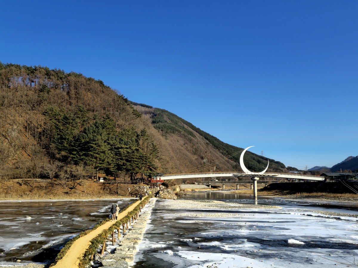 정암사를 떠나 북쪽으로 한 시간을 달리면 정선아리랑의 발상지 아우라지를 만난다. 꽁꽁 언 송천에는 큰 돌로 만든 징검다리와 나무다리가 나란히 놓였고 높은음자리표 모양으로 꾸민 아리랑다리도 놓여 정선아리랑의 발상지를 알린다. 동쪽 골지천에는 아우라지 다리가 놓였는데 한가운데 설치한 커다란 초승달 조형물이 눈길을 사로잡는다. 아직 차오르지 않는 상태의 초승달을 통해 정선아리랑의 중요 정서인 사랑, 이별, 기다림, 소망을 담았다. 또 다리 뒤편이 ‘달이 떠오른다’는 뜻의 월부계곡이어서 달을 주요 조형물로 선택했다. 밤에 조명이 켜지면 골지천에 달이 비치는 그림 같은 야경을 선사한다.