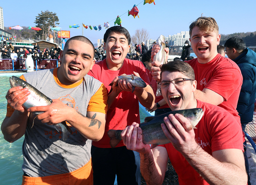 18일 강원 평창군 진부면 오대천 일원에서 열리고 있는 제20회 평창송어축제를 찾은 외국인들이 맨손으로 잡은 송어를 들어보이며 즐거워하고 있다.