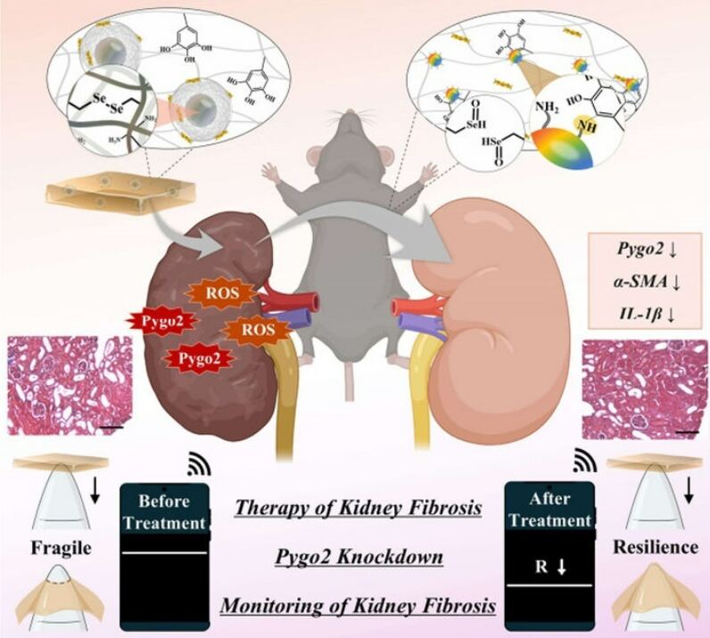 연구진은 신장 섬유화 부위에서 과도하게 생성되는 활성산소(ROS)에 반응해 물리·화학적 변형이 일어나는 하이드로겔을 설계하고, 여기에 Wnt/β-catenin 신호 전달 경로의 핵심 인자인 Pygo2 유전자를 억제하는 shPygo2를 탑재했다. 이 하이드로겔은 병변 부위의 산화 스트레스 환경을 감지해 선택적으로 유전자를 방출함으로써 치료 효율을 높이는 것이 특징이다.