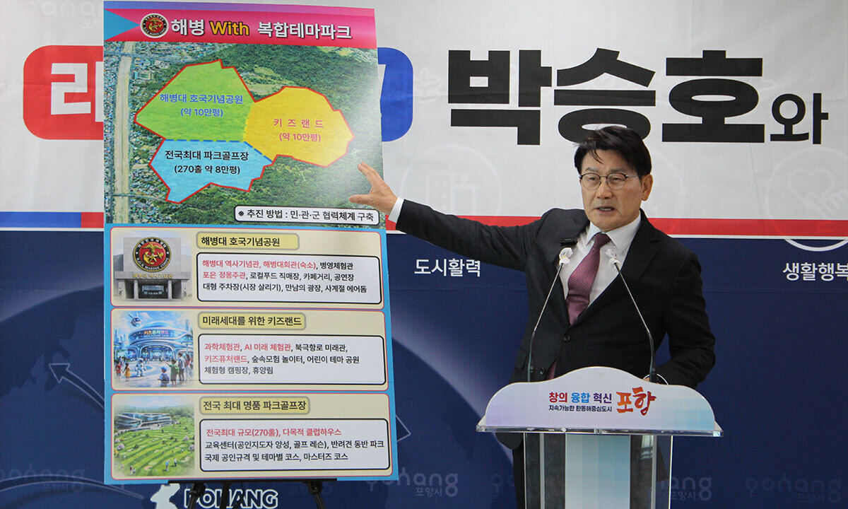 박승호 전 포항시장은 20일 오전 포항시청 브리핑룸에서 기자회견을 열고, 오천 해병대 사격장 이전 부지를 시민에게 온전히 돌려주는 ‘해병 WITH 복합테마파크’ 구상을 공식 발표하며 “오천을 포항의 새로운 성장축으로 전환하겠다”고 밝혔다.