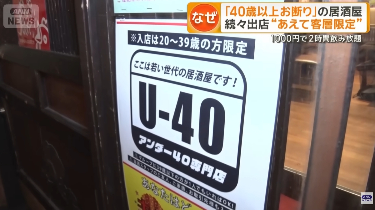 보도에 따르면 시부야의 한 술집 입구에는 ‘20~39세로 한정한 젊은 세대의 술집’이라는 안내문이 붙어 있다. 사실상 40세 미만 손님만 받는 전문 매장이다. 매장을 운영하는 나가노 토시히로씨는 연령 제한 이유를 묻는 방송사에 “원래 매장을 찾는 고객층이 젊은 편”이라며 “간혹 연령대가 높은 손님들로부터 매장이 시끄럽다는 불만이 제기된 적이 있다”고 설명했다. 차라리 처음부터 이용 고객 연령대를 명확히 설정해 세대 간의 마찰 없이 모두가 편하게 즐길 수 있는 공간을 만들고자 했다는 취지로 들린다.