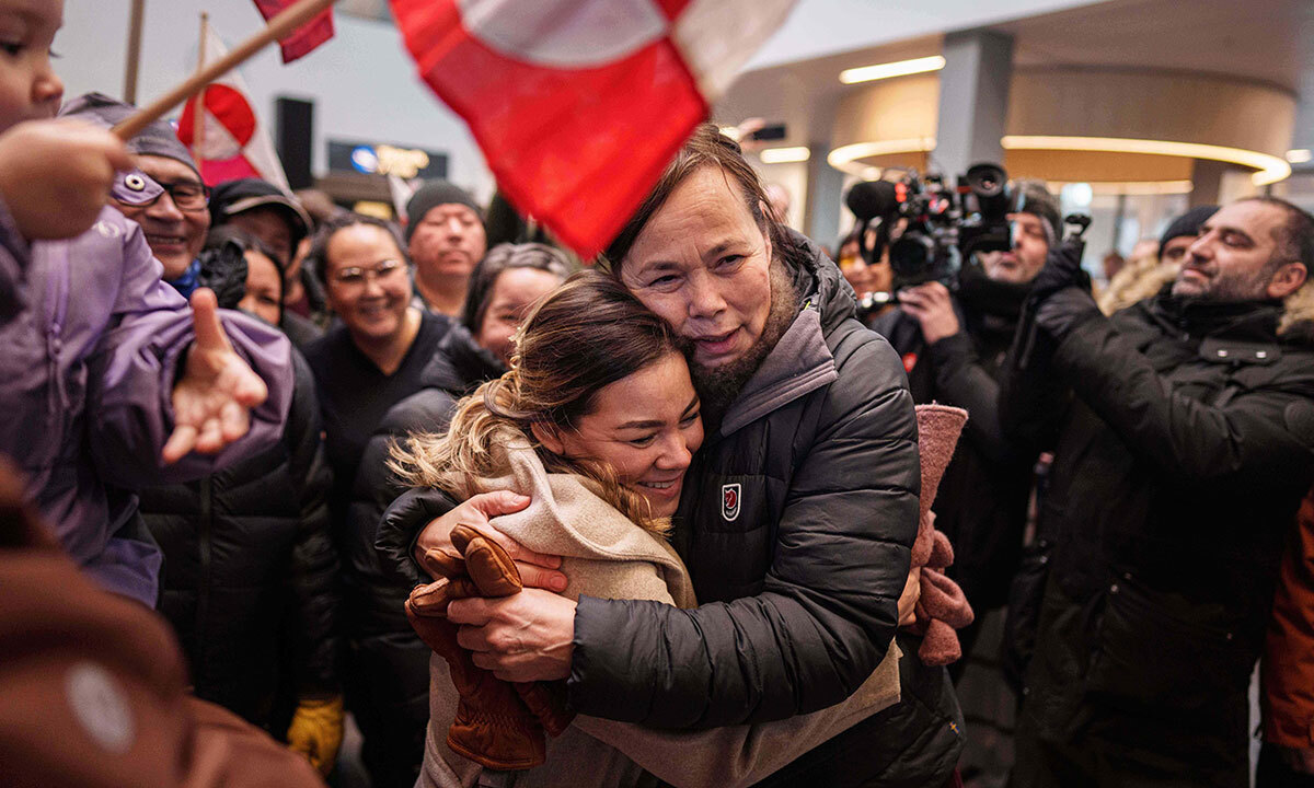 그린란드 문제와 관련해 미국 워싱턴 백악관에서 미국·덴마크 정부와 회담을 마치고 돌아온 비비안 모츠펠트 그린란드 외무장관(왼쪽)이 20일(현지시간) 수도 누크 공항에 도착해 환영 나온 시민과 포옹하고 있다.