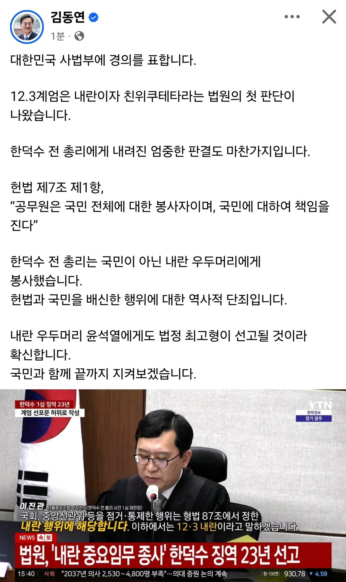 그러면서 한 전 총리의 행동에 대해 “국민이 아닌 내란 우두머리에게 봉사했다. (사법부 판단은) 헌법과 국민을 배신한 행위에 대한 역사적 단죄”라고 강조했다.