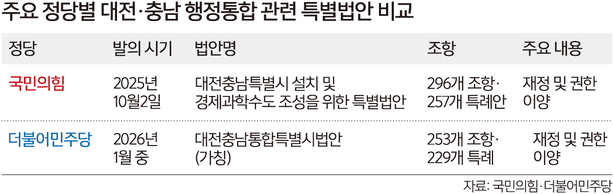 다음주쯤 발의될 것으로 보이는 민주당 특별법안에는 253개 조항과 229개 특례가 담길 것으로 전해졌다. 통합특별시 명칭은 국민의힘 법안과 같은 대전·충남통합특별시이다. 교육감 선출방식과 관련해 국민의힘 법안은 통합시장과의 동반선거(러닝메이트제) 여지를 둔 반면 민주당은 통합교육감 선출을 원칙으로 한 것으로 알려졌다.