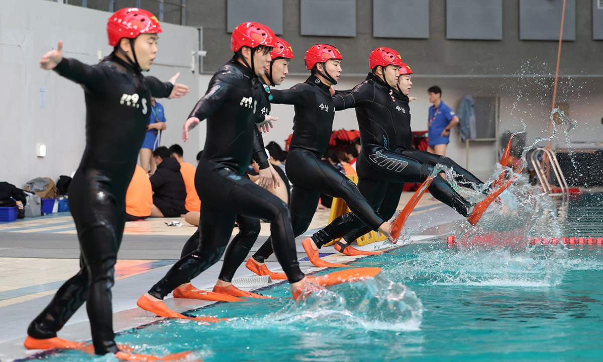21일 인천 미추홀구 문학박태환수영장에서 부평소방서 119구조대원들이 현장대응능력 강화를 위한 수난 인명구조훈련을 하고 있다.