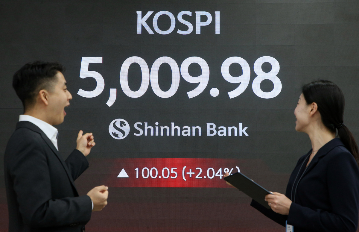 22일 오전 서울 중구 신한은행 본점 로비에 전광판에 코스피지수가 장중 5000을 돌파하고 있다. 신한지주 제공