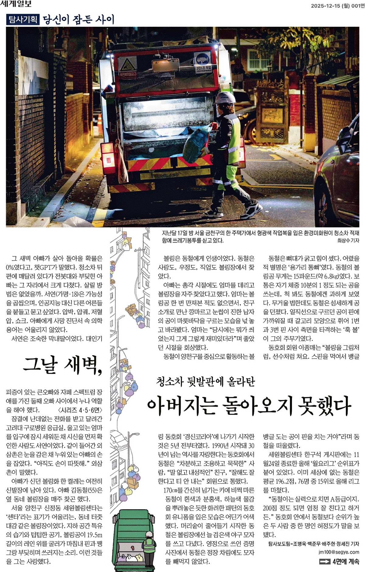 한국기자협회는 23일 세계일보 탐사보도팀 조병욱·백준무·배주현·정세진, 사진부 최상수 기자의 ‘당신이 잠든 사이’ 보도를 기획보도 신문·통신 부문 수상작으로 선정했다고 밝혔다.