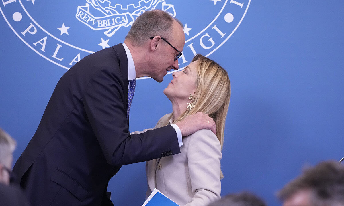 23일(현지시간) 로마에서 정상회담을 한 프리드리히 메르츠 독일 총리(왼쪽)와 조르자 멜로니 이탈리아 총리가 공동 기자회견을 마친 뒤 친밀한 인사를 나누고 있다. AP연합뉴스