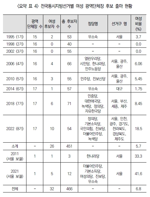 여성 정치인들의 도전이 없었던 건 아니다. 1∼8회 지방선거에 여성 26명이 광역단체장 후보로 출마했다. 가장 최근인 2022년 8회 지방선거 땐 역대 가장 많은 10명에 달했다. 다만 1∼8회 지방선거 전체 후보자 451명 중 여성 비율은 5.8%에 그쳤다.