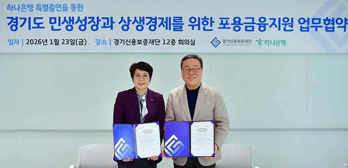 경기신보는 23일 수원시 영통구 사옥에서 시석중 이사장과 전정숙 하나은행 경기영업본부 지역대표 등이 참석한 가운데 이 같은 내용의 ‘경기도 민생성장과 상생 경제를 위한 포용금융지원 업무협약’을 교환했다.