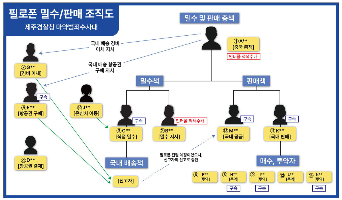 경찰은 이로써 필로폰 국내 유통 조직과 투약자 12명을 검거해 최초 제주로 밀반입한 1명과 배송책 1명, 판매책 2명, 매수·투약자 3명 등 총 7명을 구속했다.