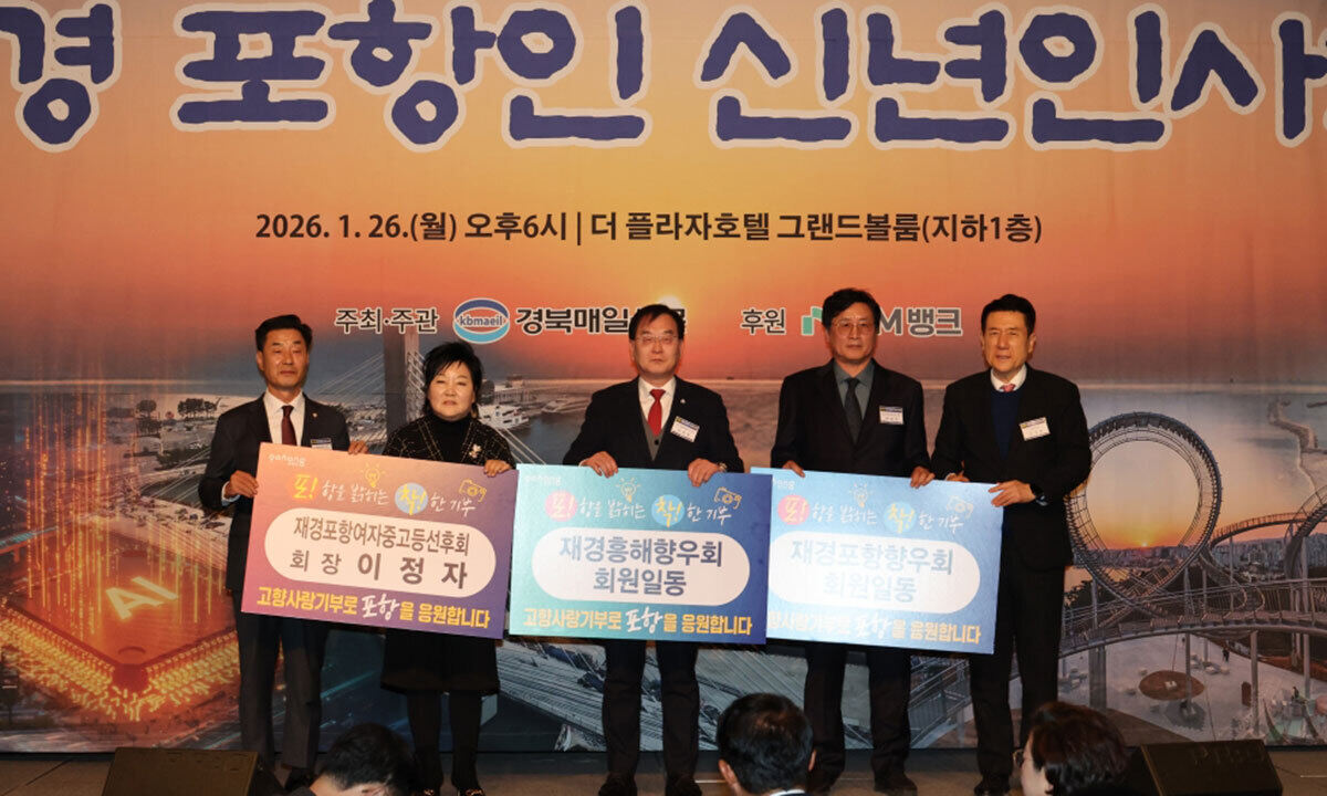 경북 포항시는 26일 서울 더 플라자호텔에서 열린 ‘2026년 재경 포항인 신년인사회’에서 재경 출향인들이 고향 발전을 염원하는 마음을 담아 고향사랑기부금을 기탁하며 뜨거운 고향 사랑을 실천했다고 27일 밝혔다.