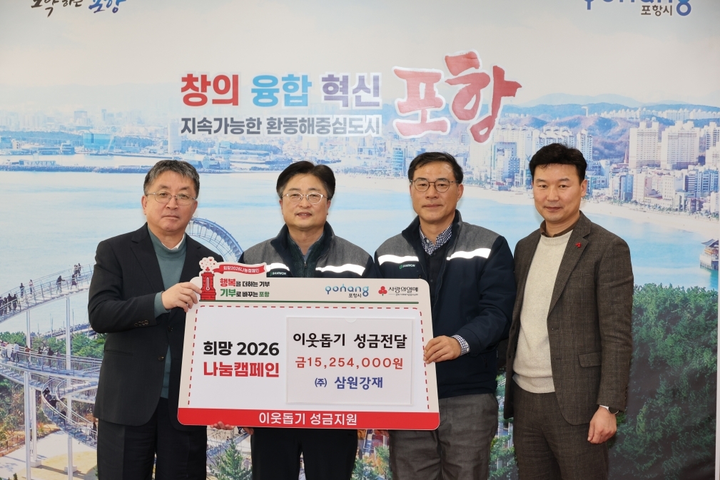 장상길 포항시 부시장은 “경기 침체 등 어려운 경영 환경 속에서도 성금을 기탁해 주신 삼원강재 임직원 여러분께 진심으로 감사드린다”며, “보내주신 소중한 성금은 겨울철 어려움을 겪는 이웃들에게 큰 힘이 될 수 있도록 전달하겠다”고 화답했다.