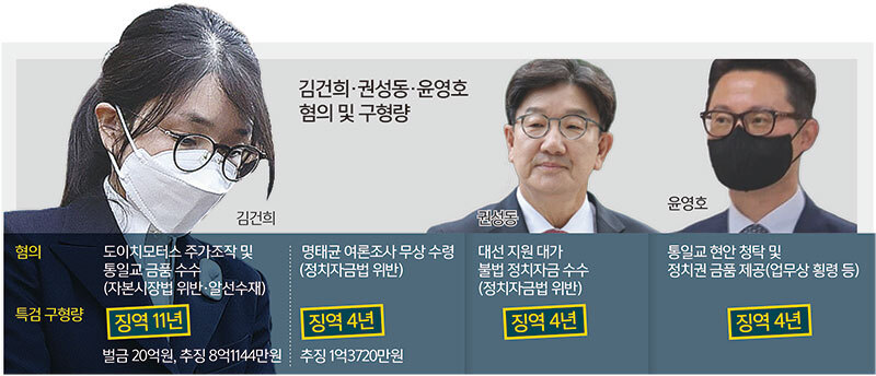 또 2022년 4∼7월 ‘건진법사’ 전성배씨와 공모해 통일교 관계자로부터 교단 지원 청탁과 함께 그라프 목걸이, 샤넬 가방 등 8000만원 상당의 금품을 받은 혐의도 받는다. 특검팀은 지난달 결심공판에서 도이치 주가조작, 통일교 금품 수수 혐의에 징역 11년과 벌금 20억원, 추징금 8억1144만원을, 여론조사 무상 수령 혐의에 대해선 징역 4년과 추징금 1억3720만원을 각각 구형했다.