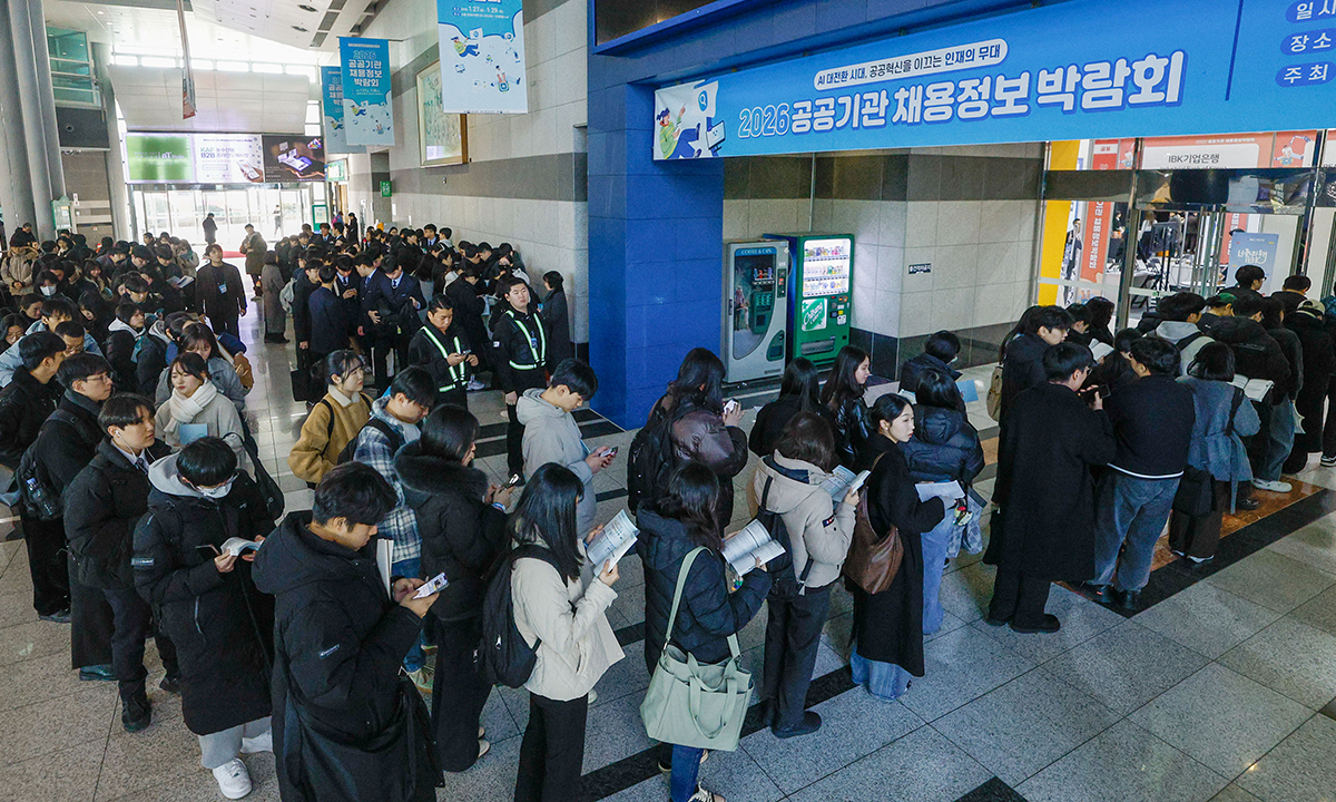 27일 서울 서초구 aT센터에서 ‘2026 공공기관 채용정보 박람회’가 열린 가운데 구직자들이 줄을 서서 행사장 입장을 기다리고 있다. 이번 박람회는 코레일, 국민건강보험공단, 한국전력 등 148개 기관이 참여해 공공기관 취업준비생들에게 채용 관련 정보 및 맞춤형 구직 지원 프로그램을 운영한다.