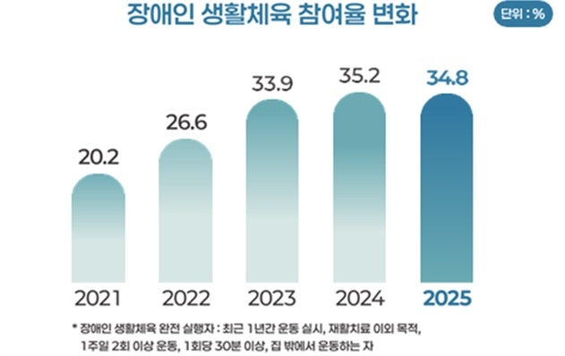 문화체육관광부와 대한장애인체육회는 28일 발표한 2025년 장애인 생활체육조사 결과에 따르면 조사에 따르면, 주 2회 이상 1회당 30분 이상 집 밖에서 운동한 장애인 생활체육 참여율은 2024년 35.2%에서 0.4%포인트 감소했다. 장애 유형별 참여율에선 뇌병변장애인(19.6%), 발달장애인(29.5%)의 생활체육 참여율이 현저히 낮았다. 이번 조사는 전국에 등록된 만 10∼69세 장애인 1만명을 대상으로 진행했다.