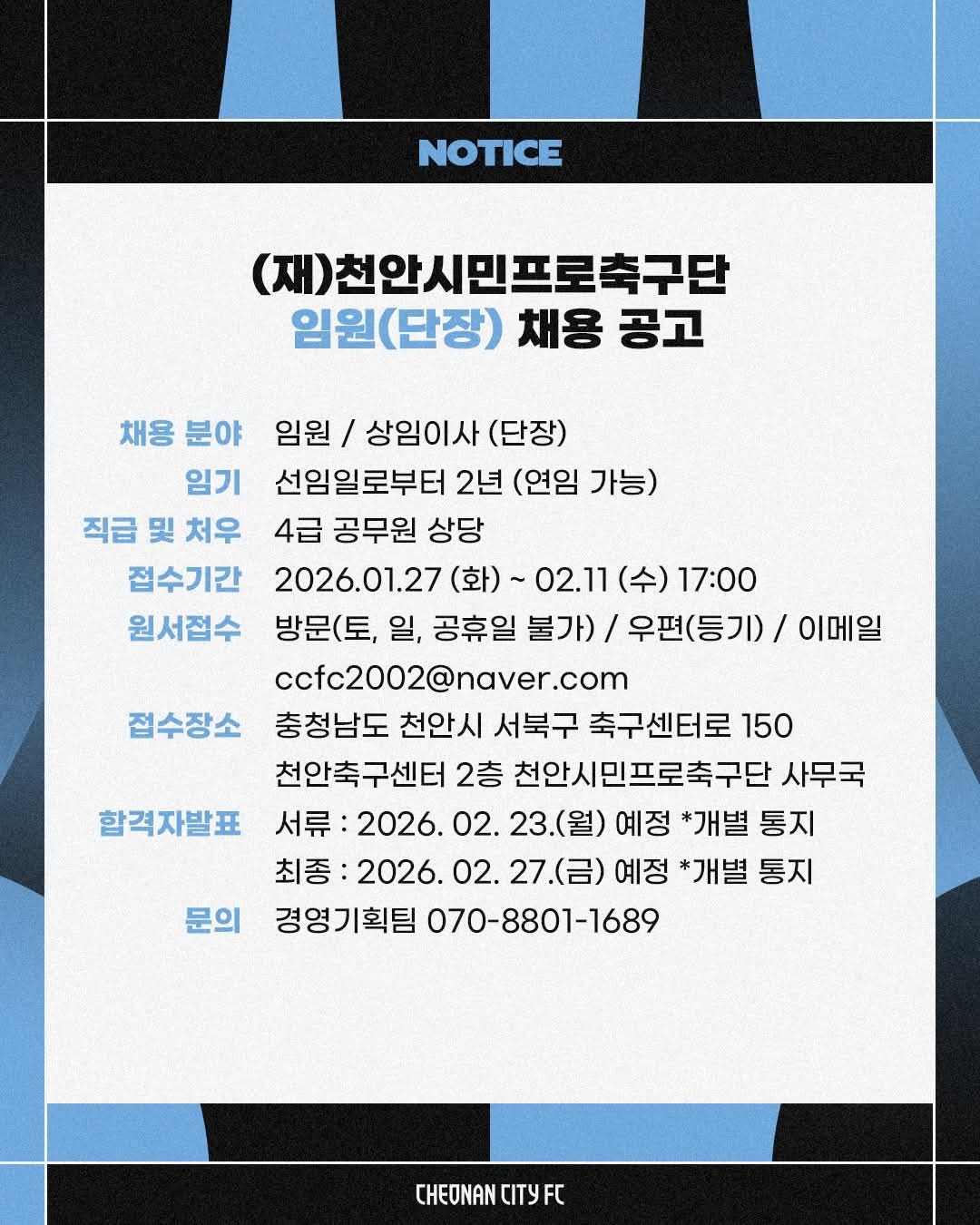 천안시는 “이번 결정은 관련 법령과 정관에 따른 합법적 절차 속에서 이뤄진 것”이라며 “시민과 구단의 장기적인 경쟁력 확보를 최우선에 둔 판단임을 이해해 달라”고 밝혔다.