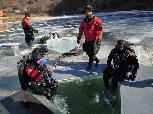 28일 경북119특수대응단 구조대원들이 안동시 도산면 가송리 일원에서 결빙된 저수지의 얼음판 붕괴 사고를 가정해 익수자를 구조하는 훈련을 진행하고 있다.