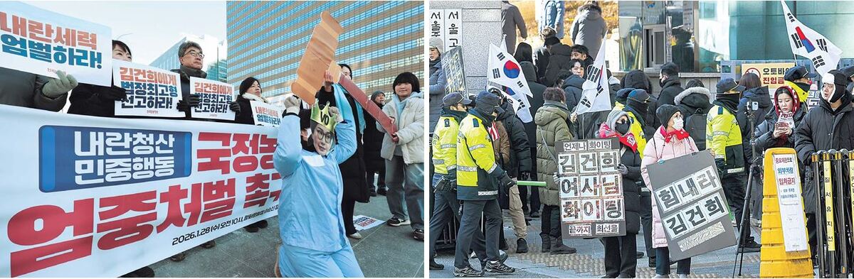 다만 서울 서초동 일대는 예상보다는 한산한 모습이었다. 진보·보수 진영은 각각 집회를 신고했으나, 인파가 몰리진 않았다. 경찰에 따르면 이날 낮 12시 법원 앞 삼거리 인근 정곡빌딩 앞에 진보·보수 진영이 각각 집회를 신고했다. 진보 성향 유튜버는 ‘김 여사 처벌 촉구’라는 이름으로 50명, 보수 단체는 ‘김 여사 응원’으로 2000명을 신고했다. 하지만 선고가 시작된 오후 2시쯤 보수 집회장은 주최자 한 사람만 자리를 지키고 있었고, 윤 전 대통령의 얼굴과 ‘국민이 불러낸 대통령’이 적힌 깃발만 바람에 펄럭이고 있었다. 10여m 떨어진 곳에서는 진보 진영 유튜버 8명가량이 선고 생중계 영상을 틀어 두고 각기 자신의 방송을 진행했다.