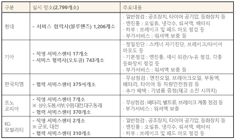무상점검 서비스에는 현대차, 기아, 한국GM, 르노코리아, KG모빌리티(KGM) 등 국내 5개 제작사가 모두 참여한다.
