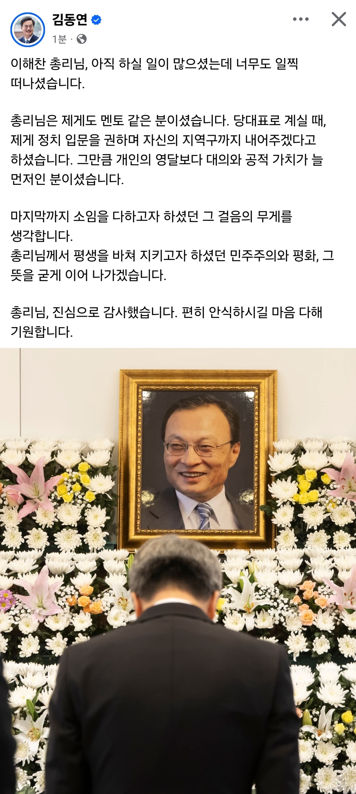 같은 날 김 지사는 자신의 사회관계망서비스(SNS)에 “아직 하실 일이 많으셨는데 너무도 일찍 떠나셨다. 개인의 영달보다 대의와 공적 가치가 늘 먼저인 분이셨다”고 애도했다.