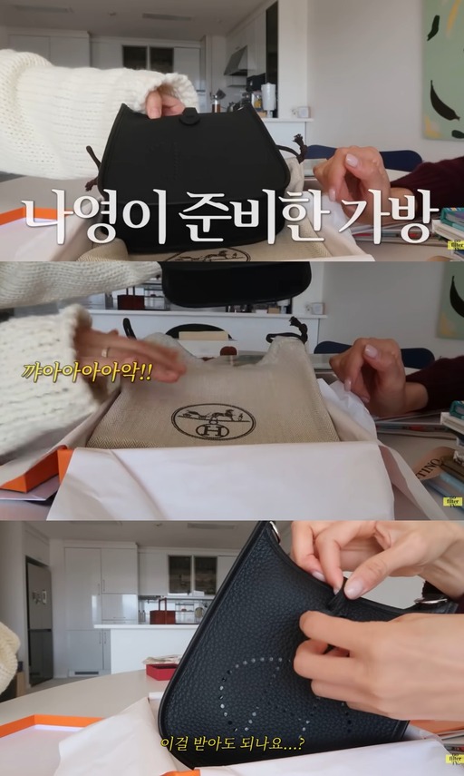 김나영은 제작진이 가방을 들어보는 모습을 흐뭇하게 바라보며 "오 예쁘다. 잘 어울린다"고 칭찬했다.