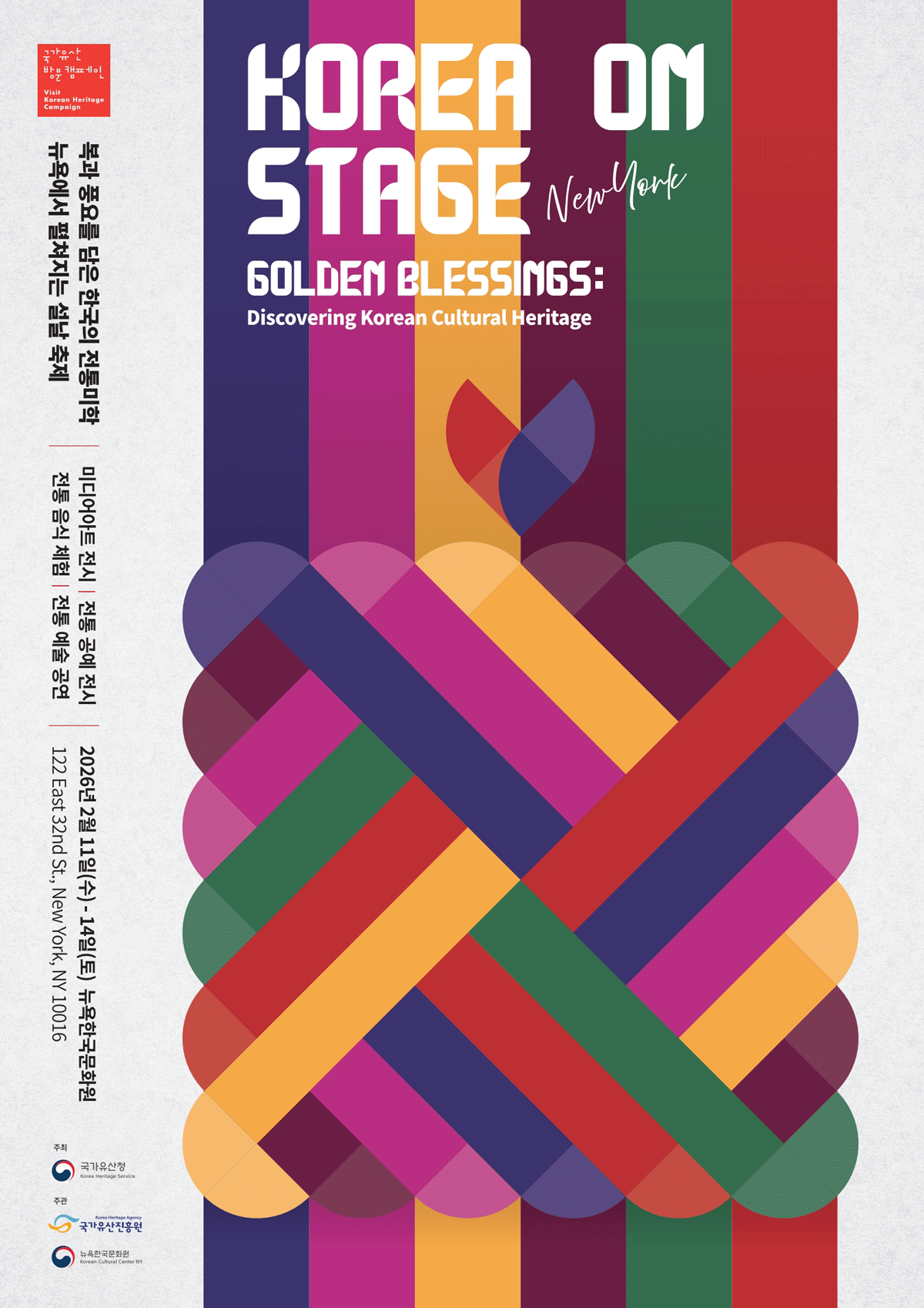 국가유산청은 국가유산진흥원, 뉴욕한국문화원과 함께 다음 달 뉴욕에서 ‘코리아 온 스테이지 인 뉴욕’(Korea on Stage in New York·포스터)을 개최한다고 29일 밝혔다. 국가유산 방문 캠페인의 하나로, 세계적으로 각광받고 있는 K컬처의 뿌리인 국가유산의 가치와 아름다움을 국내외에 널리 알리기 위한 행사다.