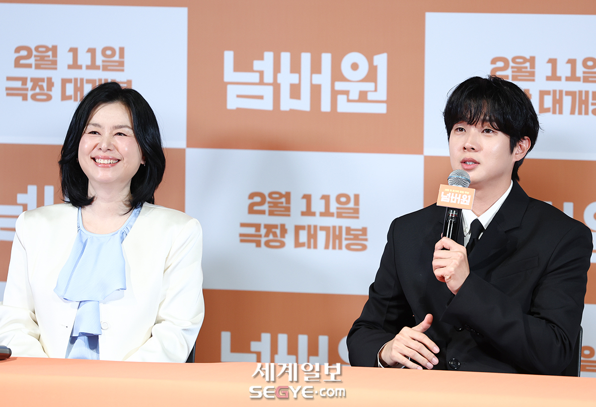 배우 장혜진(사진 왼쪽)과 최우식이 29일 서울 용산구 CGV용산아이파크몰에서 진행된 영화 ’넘버원’의 언론시사회에 참석해 대화를 나누고 있다.