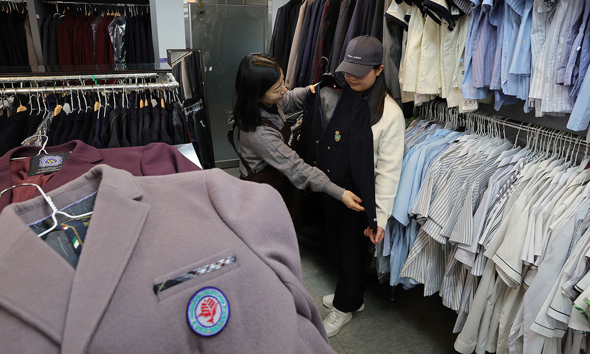 29일 서울 송파구 나눔교복매장을 찾은 시민들이 관내학교 교복을 고르고 있다. 나눔교복매장은 졸업생과 각 학교로부터 기증받은 중고 교복 2천여점이 구비돼 있으며 학교별, 계절별로 구색을 갖춘 교복의 가격은 재킷 5천원, 생활복을 비롯한 셔츠·바지·치마·조끼는 3천원에 판매한다.