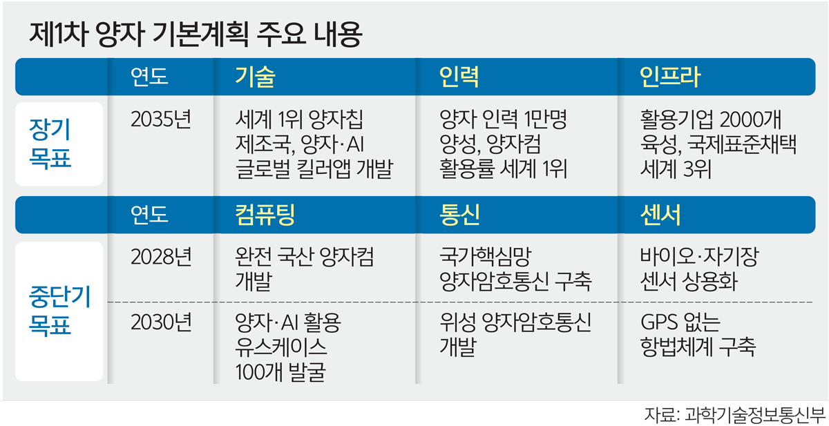 과학기술정보통신부는 29일 이런 내용의 ‘제1차 양자과학기술 및 양자 산업 육성 종합계획’과 ‘제1차 양자클러스터 기본계획’을 공개했다. 정부 차원에서 수립한 첫 양자 기술·산업 육성 종합계획이다. 정부는 양자기술산업법에 따라 5년마다 양자 종합계획을 수립하고, 연도별 시행계획을 세워야 한다.