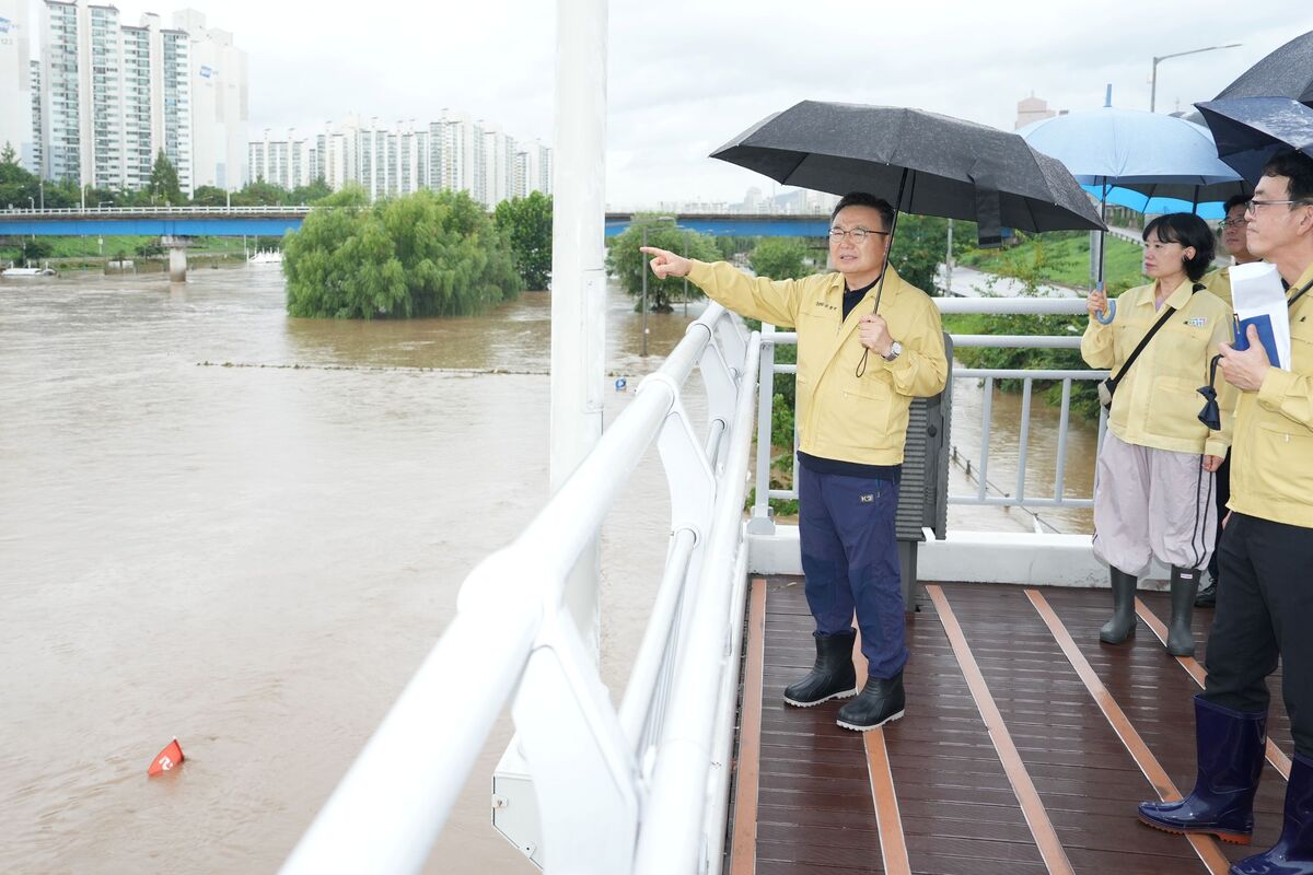류경기 중랑구청장이 지난해 8월 중랑천 홍수주의보 발표에 따라 긴급 현장 점검을 하고 있다. 중랑구 제공