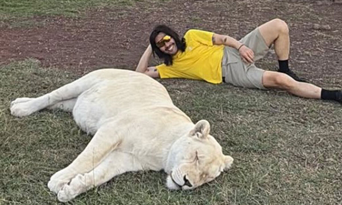 또 다른 사진에서는 아예 풀밭에 누워 있는 사자 옆에 나란히 누워 여유롭게 포즈를 취하는가 하면, 산책로를 어슬렁거리는 사자의 뒤를 쫓으며 머리를 감싸 쥐고 특유의 익살스러운 표정을 지어 보이기도 했다.