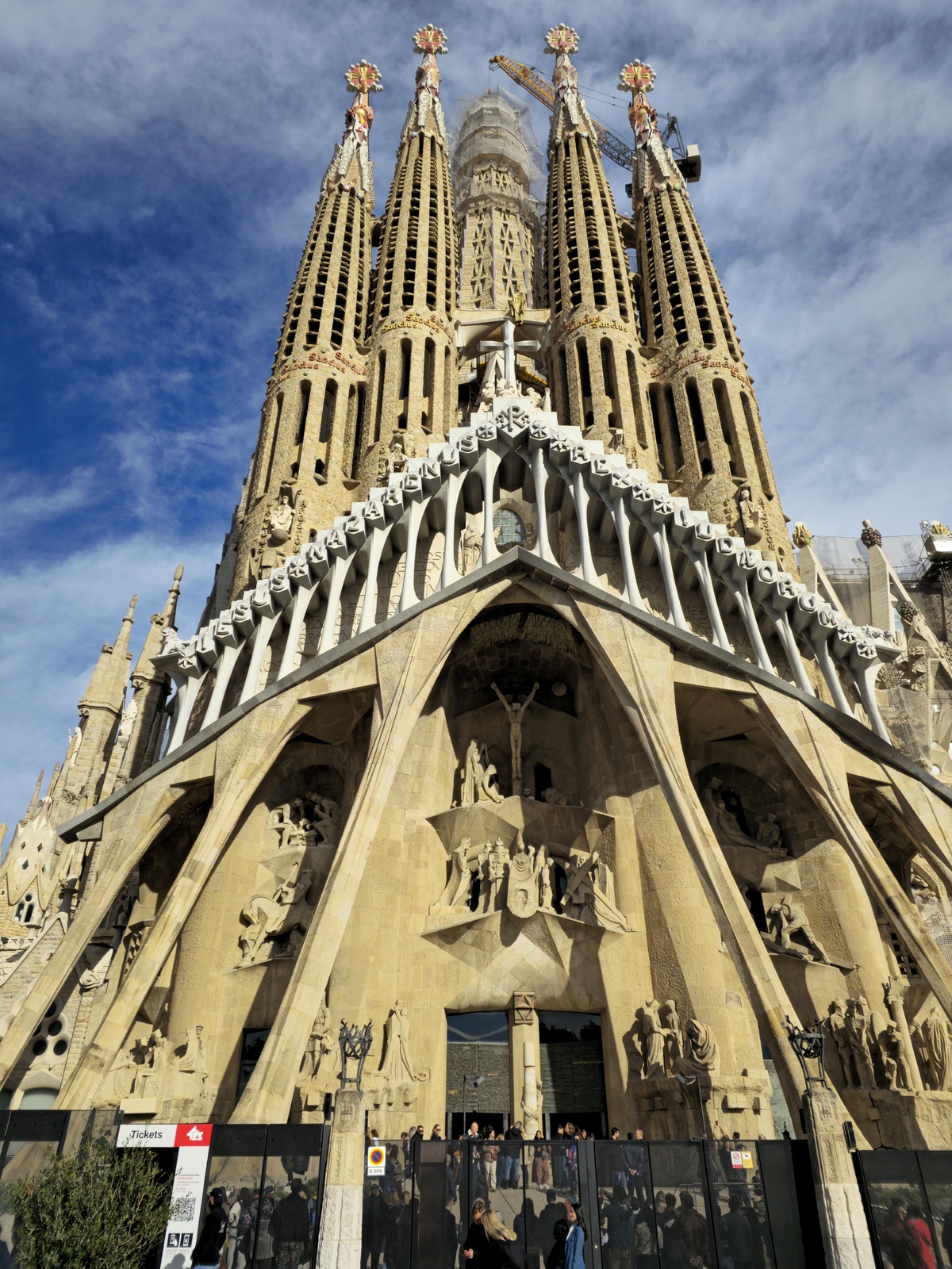 가우디는 만물이 소생하는 에너지를 표현하기 위해 마치 살아 있는 식물 줄기나 이끼처럼 보이도록 디자인했다. 자세히 보면 종려나무, 담쟁이덩굴 같은 수많은 식물과 동물이 경계 없이 엉겨 붙어 있어 전체적으로 하나의 거대한 숲 같은 인상을 준다. 직선·평면·정형성을 철저히 거부하고, 자연의 생성 방식을 그대로 건축에 옮기려 한 가우디의 철학이 잘 느껴진다. 파사드는 예수의 탄생, 어린 시절, 동방박사 3인, 천사 합창, 생명의 나무와 비둘기 등 기쁨이 넘치는 조각으로 장식했다.