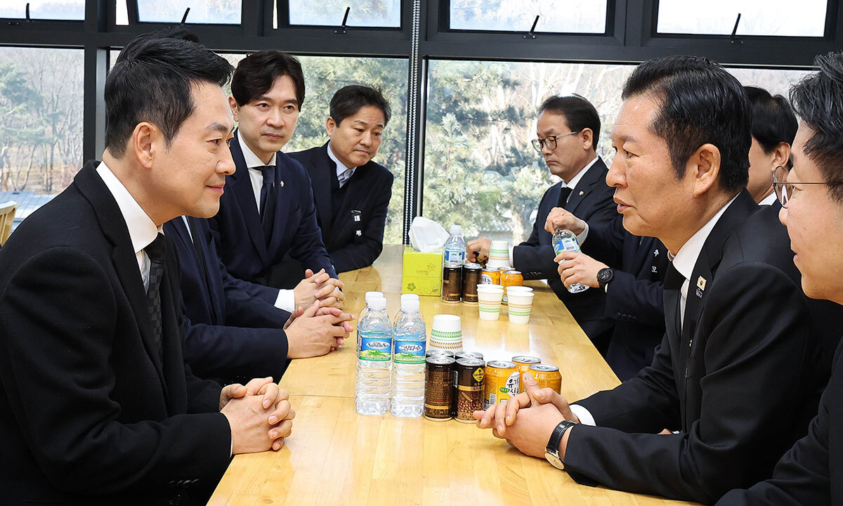 더불어민주당 정청래 대표(오른쪽)와 국민의힘 장동혁 대표가 지난달 30일 서울 종로구 서울대병원 장례식장에 마련된 고 이해찬 전 국무총리의 빈소에서 대화를 나누고 있다. 정 대표는 장 대표에게 “빨리 건강을 회복하시고 (이 전) 총리님의 뜻을 받들어 좋은 정치를 했으면 한다”고 말했고, 장 대표는 “(고인의) 뜻을 잘 받들어 저희가 좀 더 나은, 좋은 정치를 했으면 한다”고 답했다.