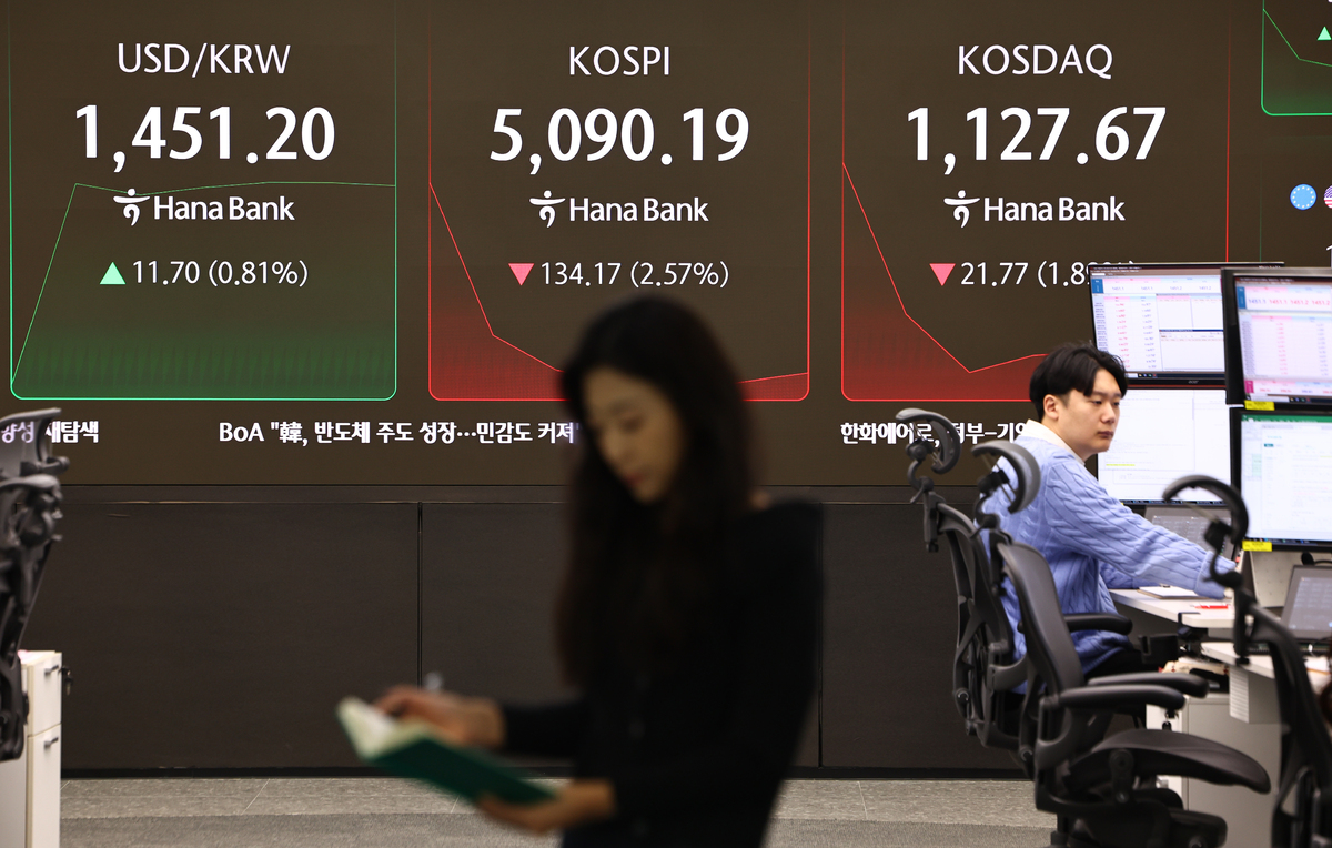 이날 오후 1시 현재 코스피는 전 거래일 대비 4.78% 급락한 4974.81에 거래되고 있다.