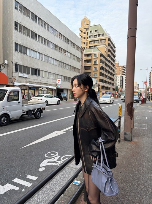 사진 속 카리나는 검정 가죽 재킷과 가죽 반바지에 검정 스타킹을 매치한 강렬한 블랙 의상을 입고 포즈를 취하고 있다. 카리스마 넘치는 패션이 돋보인다.