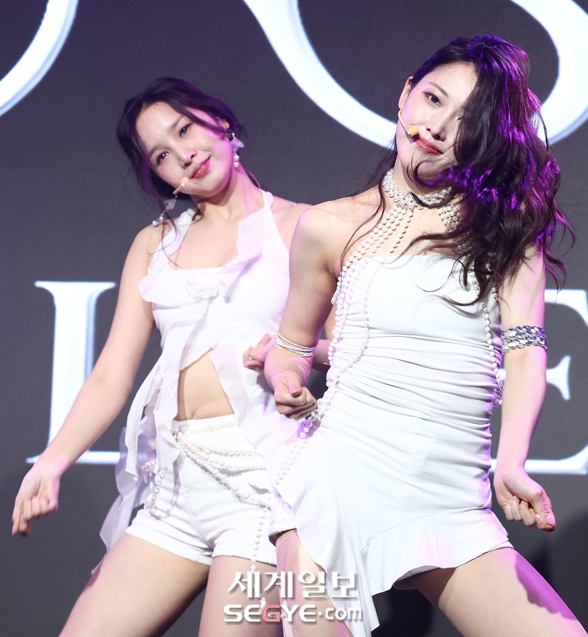 그룹 나빌레라 애니(사진 왼쪽)와 릴라가 3일 서울 동양북스 빌딩 공연장에서 진행된 데뷔 싱글 앨범 'NO LIMIT(노리미트)'의 미디어 쇼케이스에 참석해 열띤 공연을 펼치고 있다.