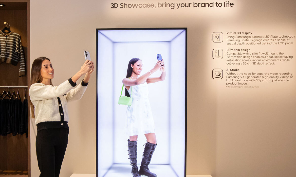 이번에 출시된 85형 스페이셜 사이니지(모델명 SMHX)는 별도의 3D 안경 없이도 깊이감 있는 입체 효과를 구현하는 차세대 디스플레이다. 삼성전자의 독자 기술인 ‘3D 플레이트’가 적용돼 52㎜의 슬림한 두께로도 화면 안쪽에 또 하나의 공간이 있는 듯한 공간감을 제공한다. 2D(2차원) 콘텐츠의 선명도를 유지하면서 깊이감 있는 3D 효과를 구현해 다양한 상업 환경에서 주목도를 높일 수 있다는게 삼성전자의 설명이다.