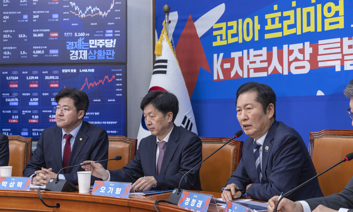 ‘코스피 5000 시대’를 맞이한 여당은 3일 기존 코스피 5000 특별위원회(특위) 명칭을 ‘코리아 프리미엄 K자본시장 특위’로 변경하고 한국 증시 대도약을 위한 입법 과제를 점검했다. 정청래 대표는 국회에서 열린 특위 회의에 참석해 “코리아 디스카운트와 완전히 결별해야 한다”며 “코스피 6000, 7000, 8000, 9000, 10000 시대는 결코 꿈이 아니다”라고 강조했다.