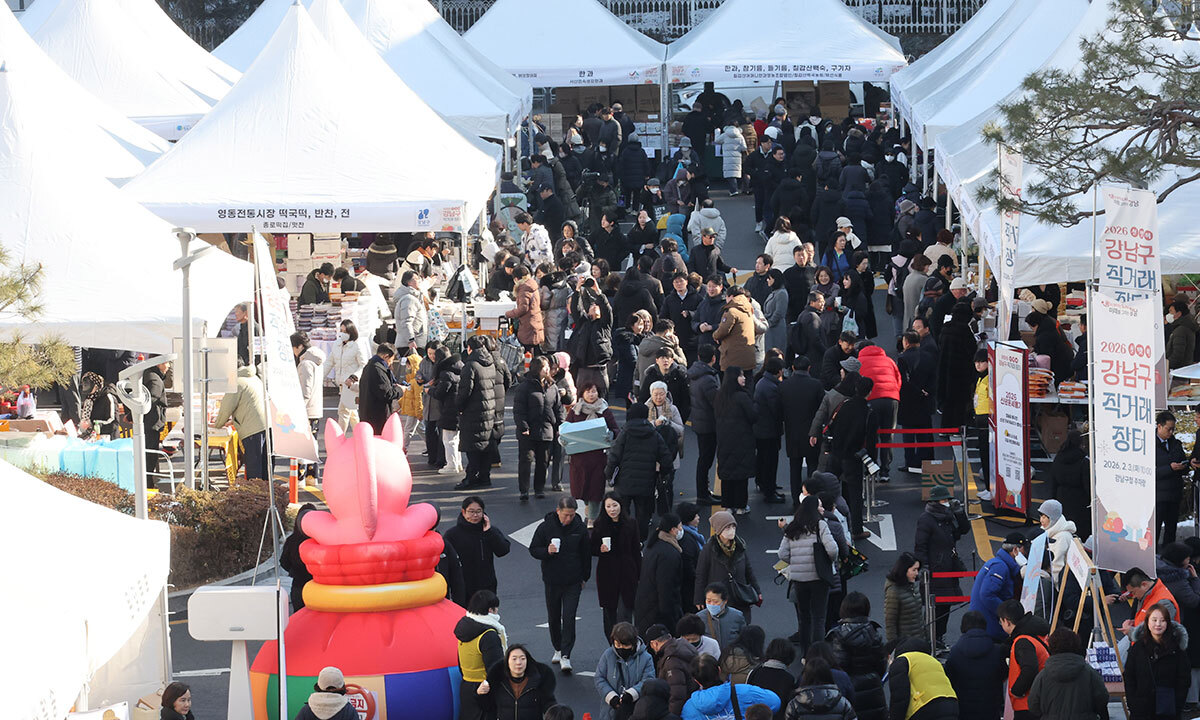 3일 서울 강남구청에서 열린 ‘2026 강남구 설맞이 직거래 장터’에서 시민들이 성수품 등을 살펴보고 있다. 강남구 직거래 장터에는 전국 40여개 지자체와 80여개 생산 농가가 참여했다.