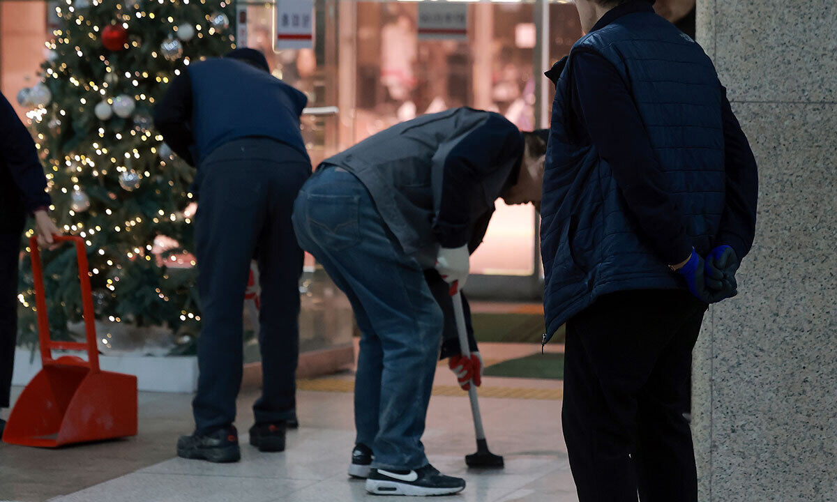 서울 한 빌딩에서 고령 미화원들이 작업하는 모습. 연합뉴스