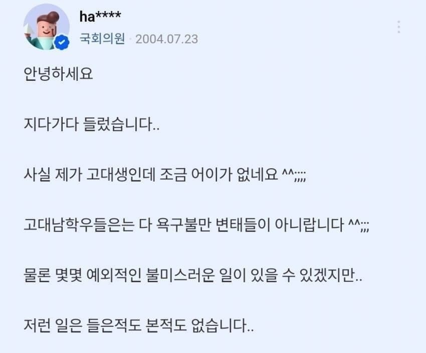 다만, “술 취한 상태에서 여학우 성희롱 하는 것은 모든 학교에서 일어날 수 있는 일이 아닌가요?”라고 써 온라인 커뮤니티 등에서 비판을 받았다.