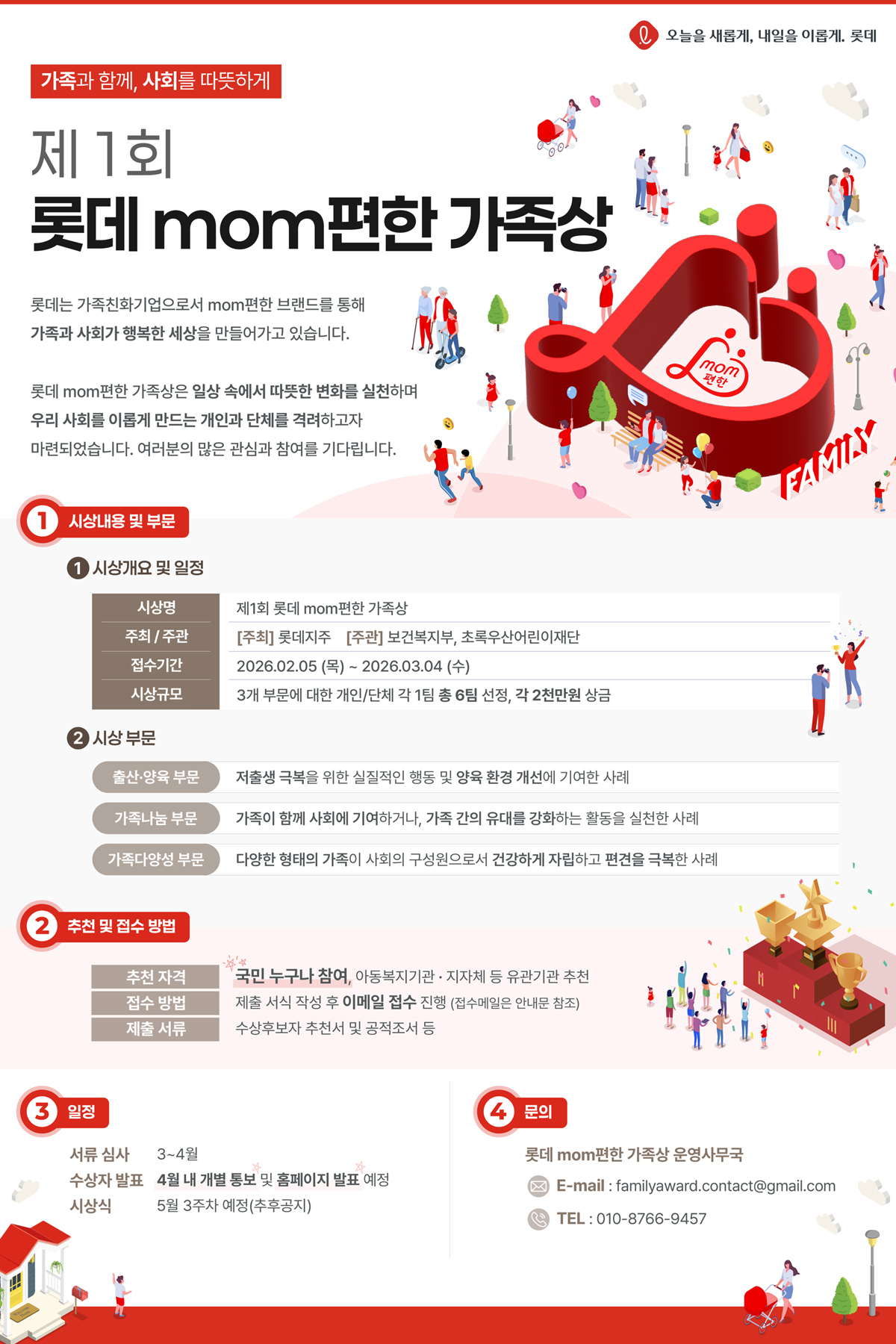롯데는 보건복지부, 초록우산과 함께 ‘롯데 mom편한 가족상’을 신설한다고 5일 밝혔다. 롯데는 일상 속 따뜻한 변화를 실천하며 우리 사회를 이롭게 만드는 개인과 단체를 격려하고자 ‘롯데 mom편한 가족상’을 기획했다.