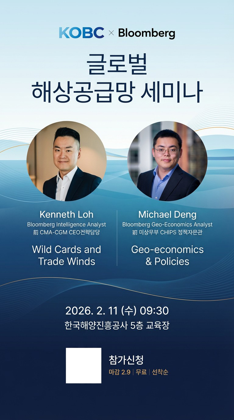 통·번역 없이 영어로 진행되는 이번 세미나는 금융·무역 정보기관인 블룸버그 소속의 세계 정상급 분석가들이 연사로 참여한다. 첫 번째 세션에서는 글로벌 해운사 CMA-CGM에서 전략 매니저를 담당한 블룸버그 인텔리전스 분석가 케네스 로가 연사로 나서 해운 시장의 불확실성 속에서 나타나는 주요 위험과 기회 요인을 분석할 예정이다. 다음 세션에서는 블룸버그 지오이코노믹스(경제·지정학 결합) 분석가 마이클 덩이 글로벌 지정학 및 산업 정책 변화가 해상공급망과 관련 산업 전반에 미치는 영향을 심도 있게 조명할 계획이다.
