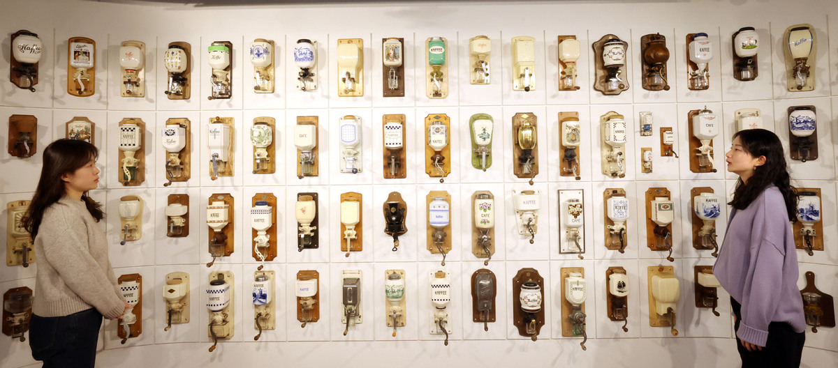 5일 서울 노원구 공릉동 도깨비시장 내에 개관한 커피그라인더 전시관 '말베르크(Mahlwerk)'를 찾은 관람객들이 전시품인 여러 종류의 커피 그라인더를 살펴보고 있다. 이번 전시는 커피그라인더 1천105점을 전시하고 전시해설프로그램, 그라인더 DIY 체험 교실, 핸드드립·커피 문화 강좌 등 프로그램을 운영한다. 전시관의 부제는 '전통시장에서 만나는 유럽 커피문화 350년'으로 18세기 수공예 그라인더부터 20세기 대량생산 모델에 이르기까지 약 350년에 걸친 커피 문화의 변천사를 한자리에서 만날 수 있다. 전시품은 커피그라인더 수집가 이승재 대표 부부가 독일 유학을 계기로 25년간 수집한 개인 소장품으로, 기네스북에 등재된 컬렉션도 포함돼 있다.