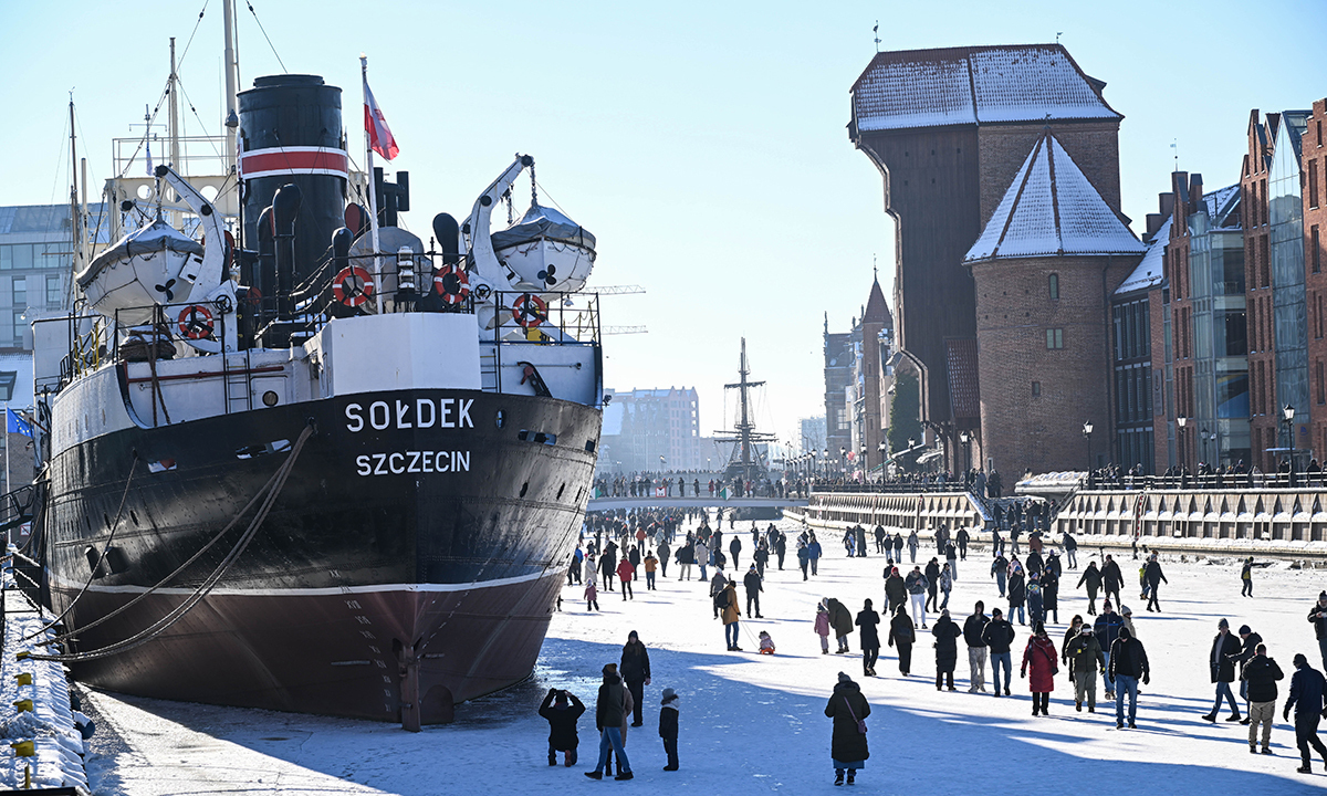 발트해와 인접한 폴란드 북부 그단스크의 모트와바강이 이례적인 한파로 얼어붙어 배가 꼼짝없이 갇힌 가운데, 1일(현지시간) 시민들이 강 위를 걸어 다니고 있다. 폴란드에서는 대부분 지역의 기온이 영하 20도 이하로 떨어지는 혹한이 수일째 이어지고 있다. 동북부 수바우키에서는 최저기온이 영하 28도, 체감온도가 영하 35도까지 내려갔다. 이번 강추위는 북극의 찬 공기가 핀란드 상공에 형성된 고기압 가장자리를 타고 폴란드와 벨라루스, 발트해 연안 3국으로 남하해 발생한 것으로 올겨울 유럽에서 가장 강력한 북극한파로 기록됐다. 이로 인해 폴란드에서만 최소 37명이 숨졌다.