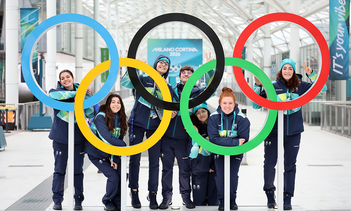 2026 밀라노·코르티나담페초 동계올림픽이 6일(현지시간) 이탈리아 밀라노 산시로 스타디움에서 개막해 17일간의 대장정에 돌입한다. 한국 대표팀은 이번 대회에서 금메달 3개 이상 획득과 종합 순위 10위 진입을 노린다. 개막을 앞둔 4일 스피드스케이팅 자원봉사자들이 오륜기 조형물 앞에서 기념 촬영을 하고 있다.