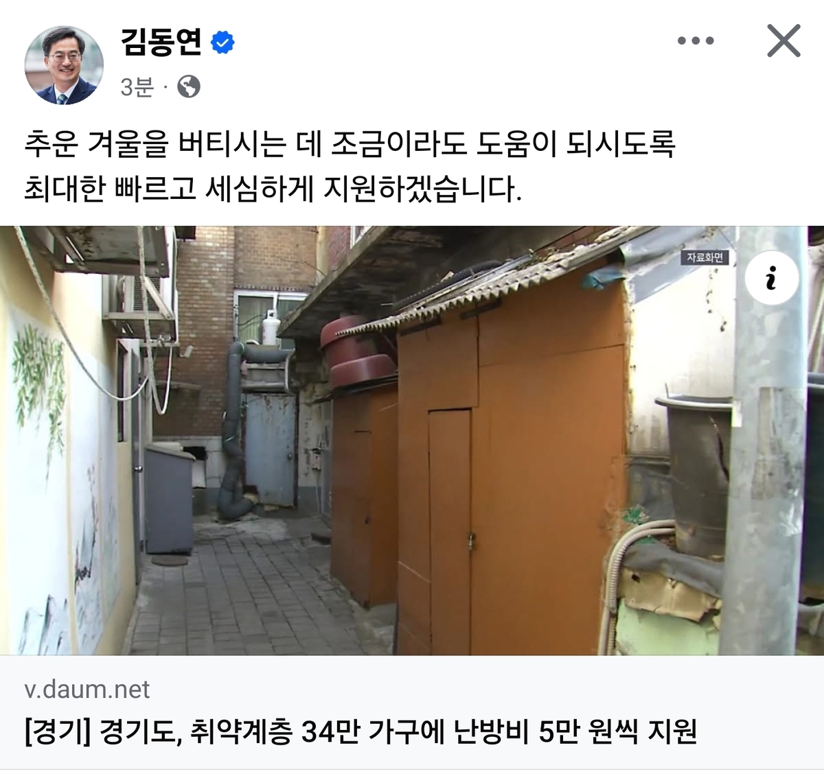 김 지사는 전날 자신의 페이스북에 올린 글에서 “추운 겨울을 버티시는 데 조금이라도 도움이 되도록 최대한 빠르고 세심하게 지원하겠다”고 밝혔다.
