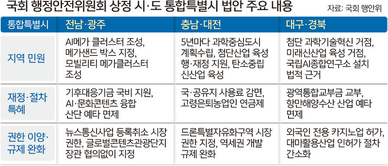 광주·전남과 대전·충남, 대구·경북 등 6개 광역자치단체의 행정통합 법안을 넘겨 받은 국회 행정안전위원회가 3개 법안 간 들쭉날쭉한 각종 특례 조항과 재정 구조를 어떻게 조율할지에 관심이 쏠리고 있다.